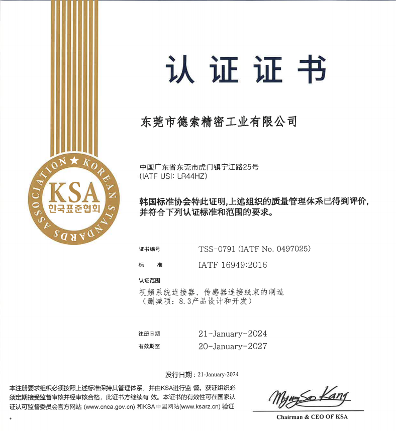 ??東莞市德索精密工業有限公司(以下簡稱“德索精密”)擁有?KSA(韓國標準協會) 審核頒發的 IATF 16949:2016 質量管理體系認證。德索精密在視頻系統連接器傳感器連接線束的制造領域,已經完全具備了為全球汽車產業鏈提供高標準、高可靠性產品的硬核實力!